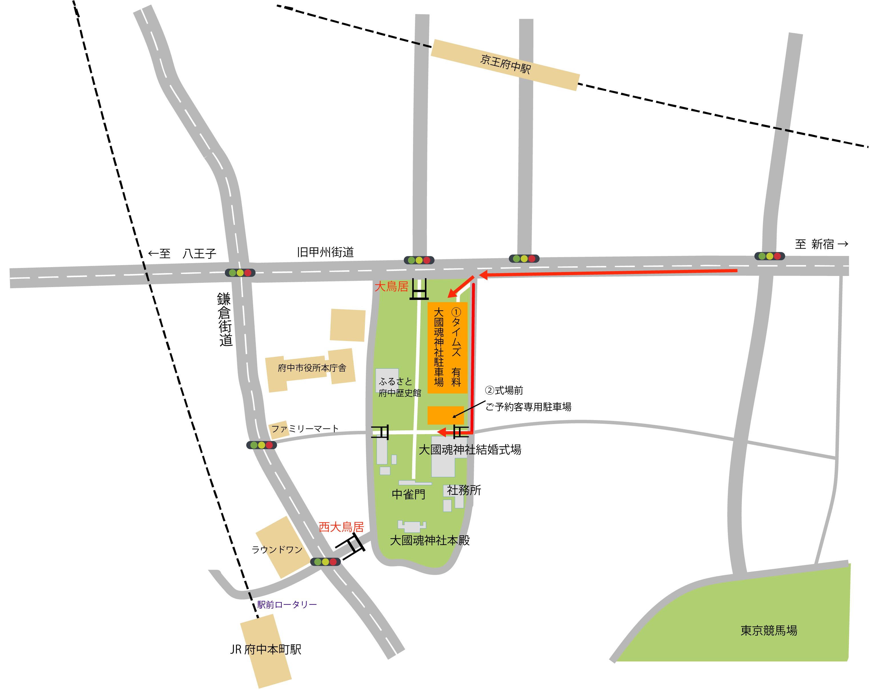 お車でのご来館の場合、平日は《結婚式場前駐車場 》(※完全予約制)・土日祝祭日は《タイムズ大國魂神社》(※有料) のご利用をお願いしております。タイムズ大國魂神社をご利用の場合、無料券3時間分をお帰り時にフロントにてお渡ししております。 ご来館後 「お祝いのお子様のお名前」をお申し付け下さい。ご予約内容をご確認の上、お支度予約のお客様からご案内させていただきます。また、ご撮影から参加されるご家族様は、撮影開始時間の15分前には、ご来館頂けますようにお願い致します。
